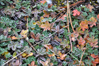 Je piétine autour des cendres refroidies de la veille, quand, soudain je vois au sol les plantes couleurs d’automne aux contours de givre : je découvre leur beauté et leur condition précaire. Je décide de faire quelques clichés et observe la finesse de ce parterre végétal que jusque là mes pieds rustres ignoraient. Après quelques compositions photographiques au motif de ces délicates mais vaillantes plantes glacées, je reprends la préparation du thé, encore seule source de chaleur possible à cette heure. Et je remarque et observe mon nouveau comportement : désormais mes pas se font délicats et précis dans leurs appuis pour respecter cette flore dont l’existence, la beauté et le courage sont venus à ma conscience. Me voilà maintenant à faire détours et pas de chat pour rejoindre la rivière car sous mes pieds, je le sais désormais, des êtres luttent pour leur survie et pour m’offrir la verdure que je suis venu chercher.